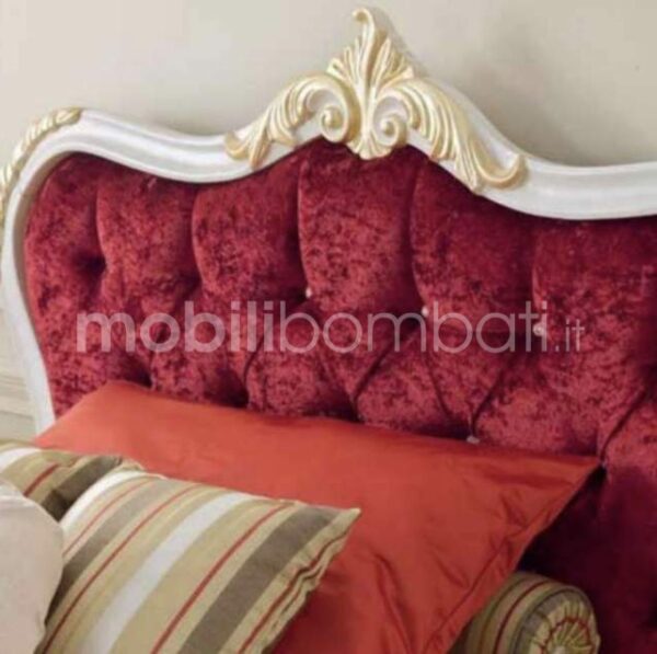 Letto stile barocco moderno in legno di faggio intagliato a mano di nostra produzione. Laccato bianco lucido con finiture in foglia oro. Letto artigianale di gran pregio da non confondere con simili di importazione che sono in resina o poliuretano.