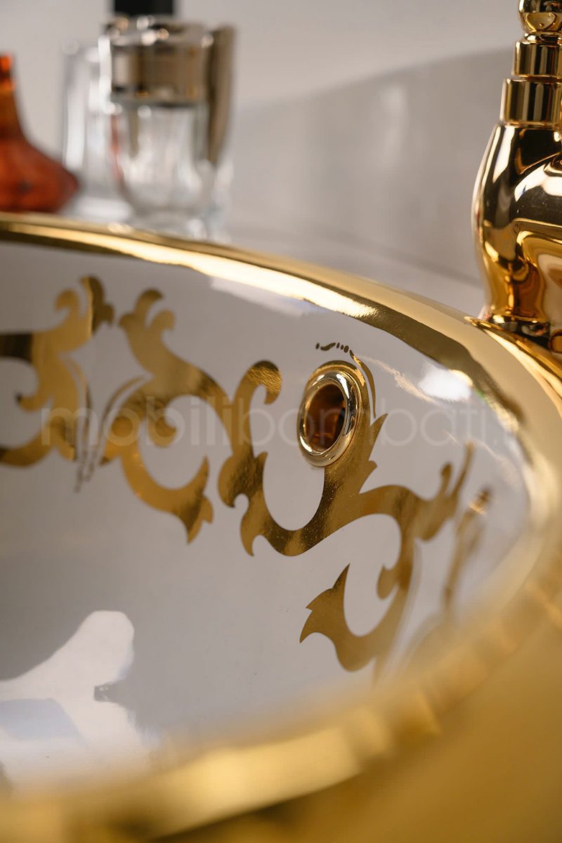 Mobile bagno stile barocco bianco con finiture foglia oro, produzione sempre di mobili bombati dal 1960.
