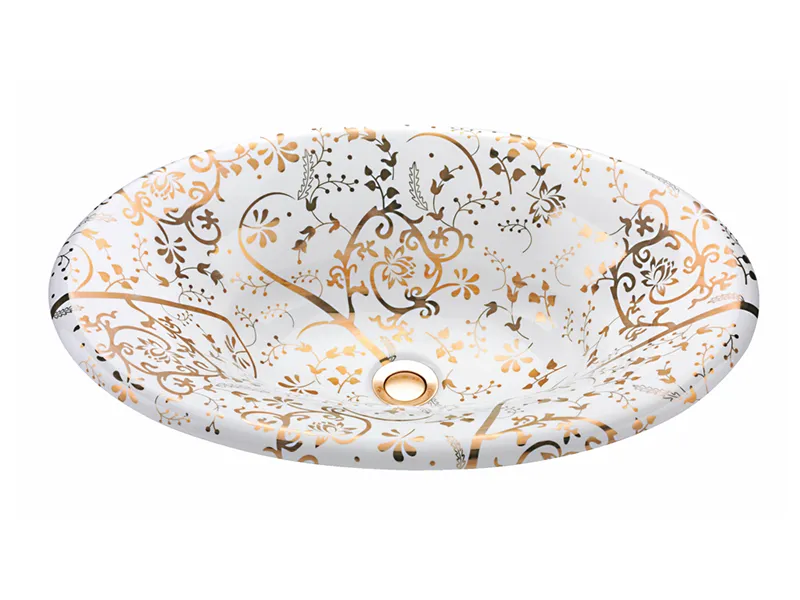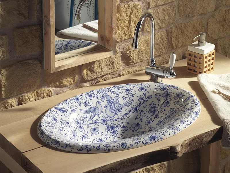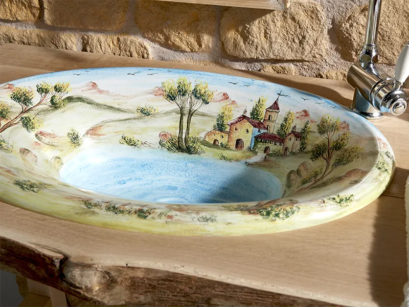 Eleganza pura in ceramica bianca e oro zecchino. Ogni vasca viene realizzata e decorata a mano da maestri ceramisti, custodi di un sapere antico reinterpretato in chiave contemporanea.